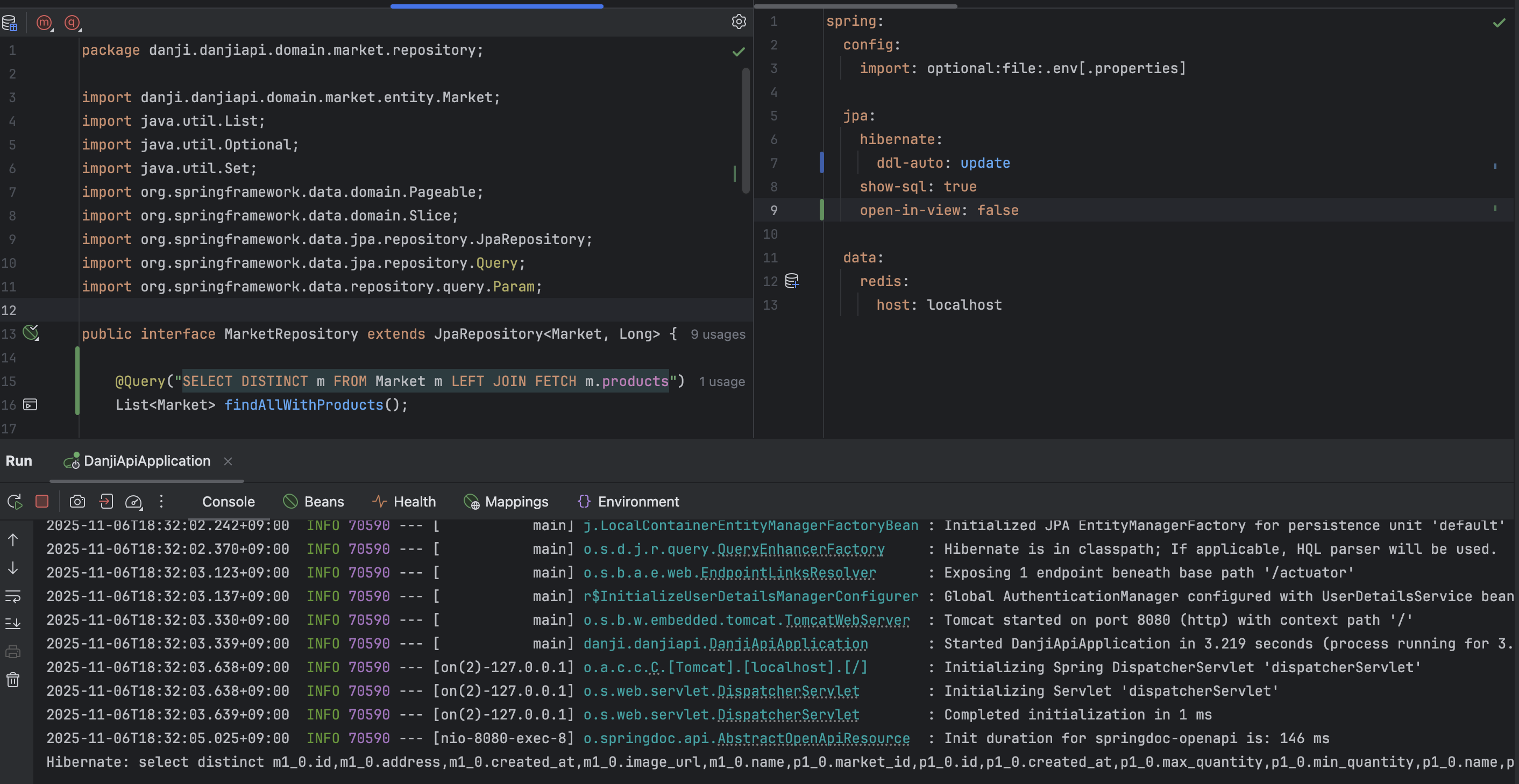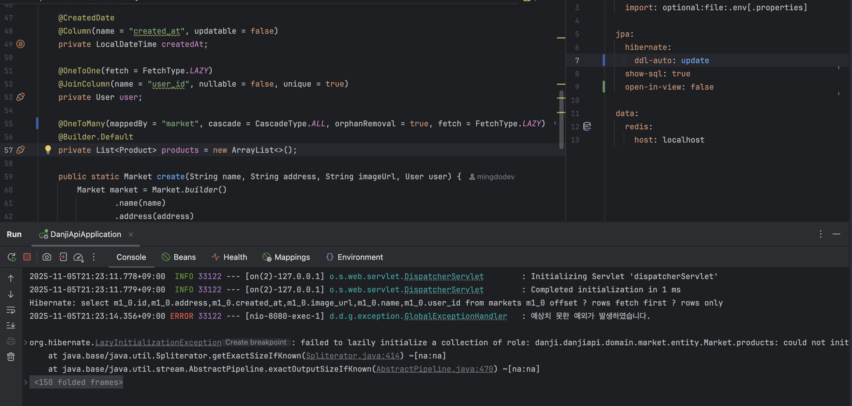 MarketDetail은 응답에 필요한 정보만 담는 DTO이다. 정적 메서드 from은 도메인 엔티티 Market에서 필요한 필드만 골라 담고, market.getProducts() 호출을 통해 연관된 Product 엔티티 컬렉션에도 접근한다. 바로 이 시점에서 지연 로딩으로 실제 데이터가 로드되는 일이 일어난다.
