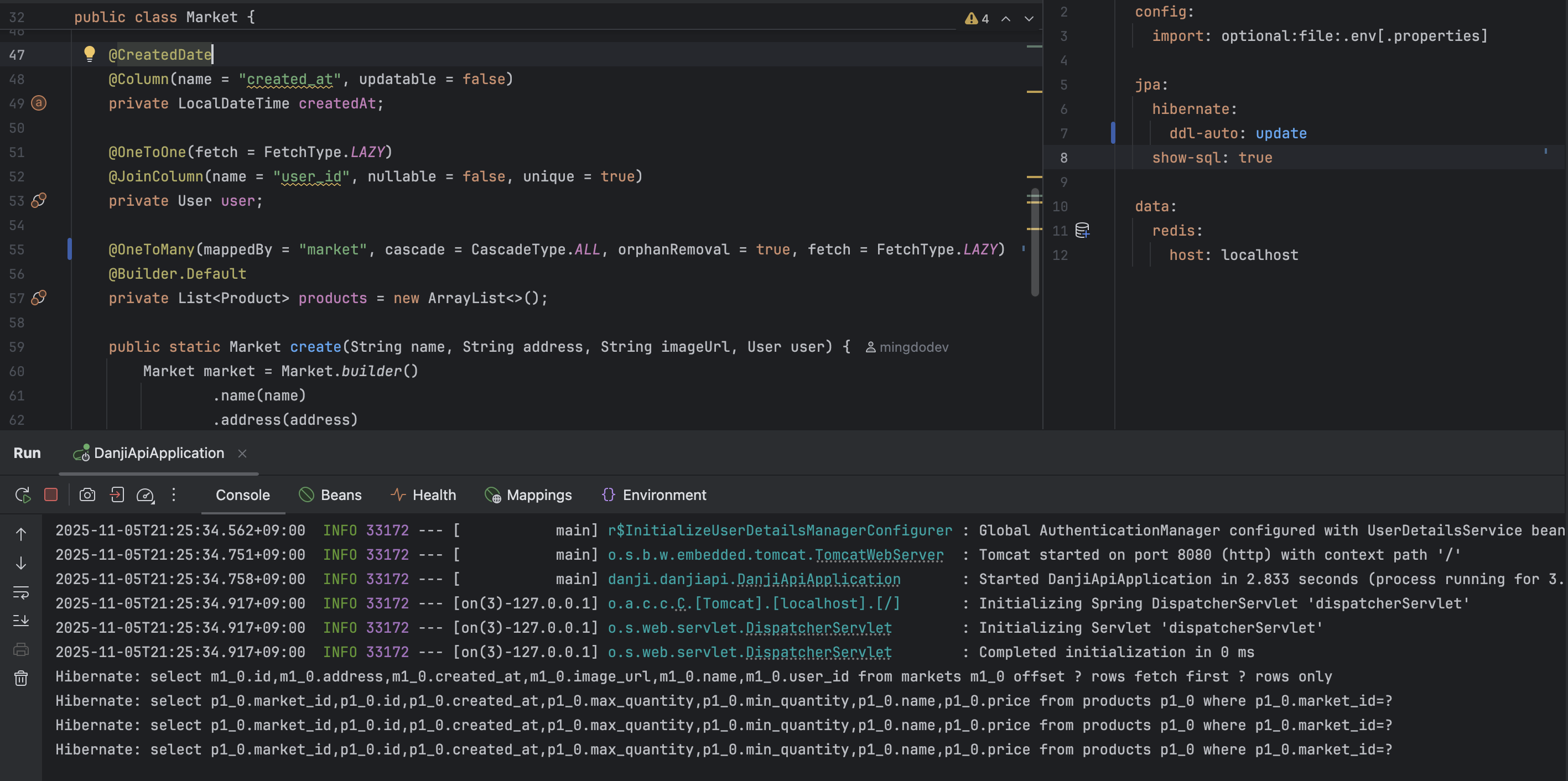 Market 엔티티는 위와 같이 Product 목록을 필드로 가지고 있으며, 이를 통해 ORM의 도움으로 연관된 상품 엔티티들을 편리하게 조회할 수 있다.